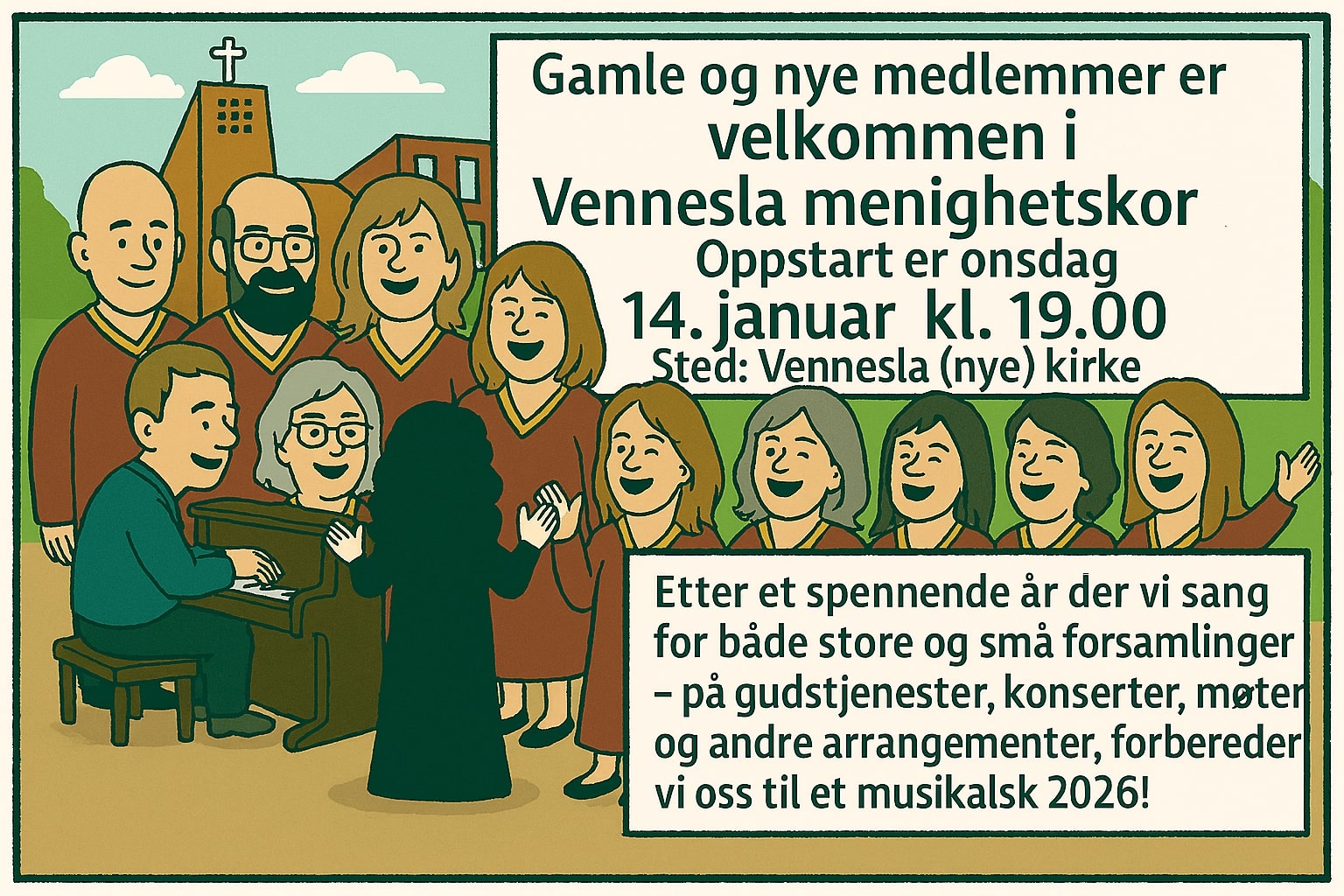 Velkommen som nytt medlem i Vennesla menighetskor! Koret øver hver onsdag unntatt bl.a. feriedager i enten Vennesla kirke eller Vennesla ga...